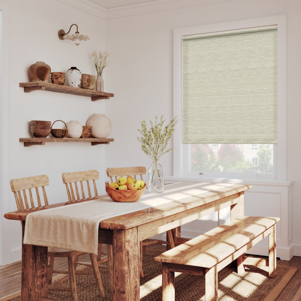 This dimout roller blind features a textured woven fabric interwoven with subtle metallic threads for a gentle shimmer. Blended hues of light and dark cream add rich depth, softly reducing daylight while perserving privacy - an elegant, versatile choice for contemporary interiors.