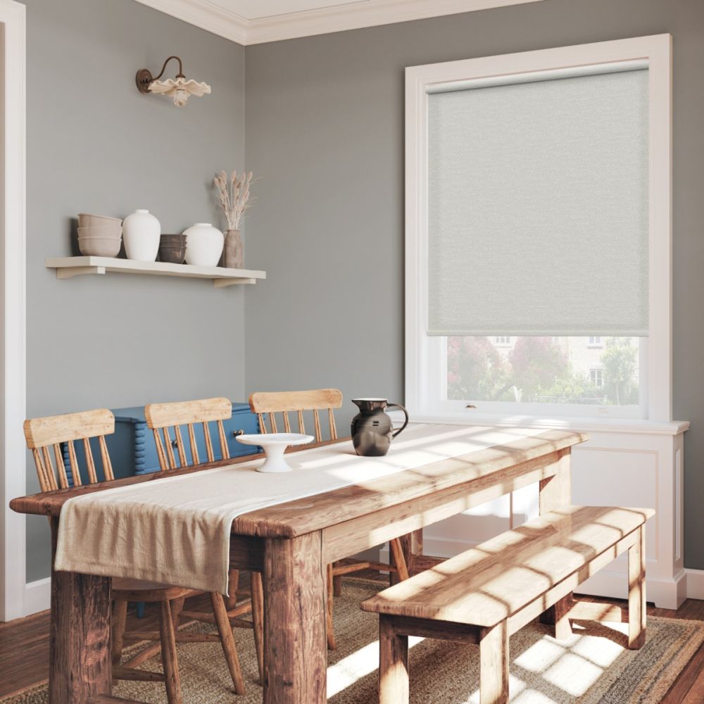 This light grey light-filtering roller blind features a soft linen-like texture that adds subtle depth and sophistication. Gently diffusing natural light while preserving privacy, it creates a calm, contemporary atmosphere perfect for modern living spaces or home offices.
