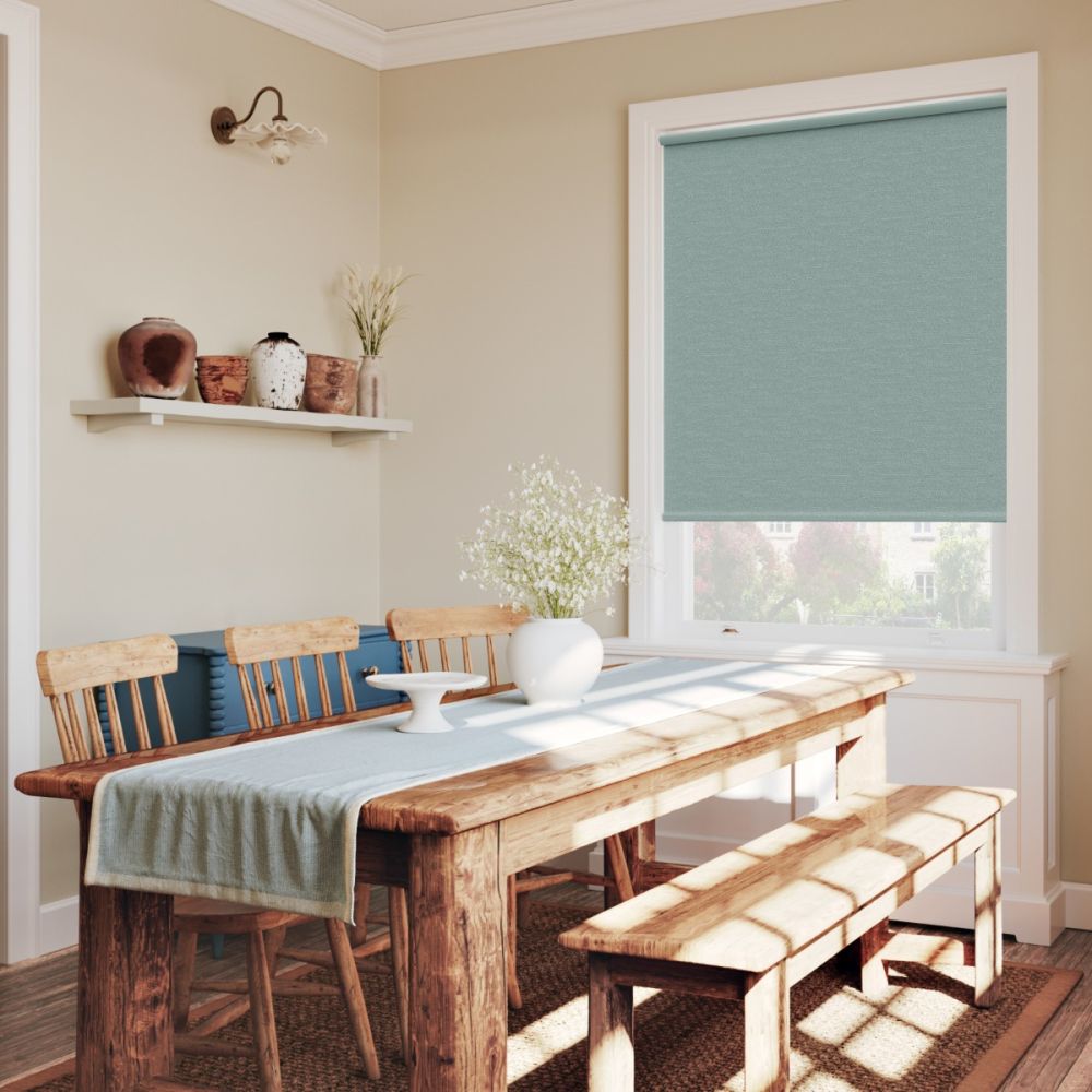 This teal blackout Roller Blind features soft grey-blue tones and a refined linen-like texture. Its blackout fabric blocks external light completely, offering perfect privacy and a serene, contemporary look ideal for bedrooms and restful living spaces.