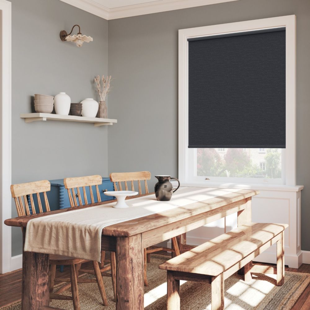 This black blackout roller blind features a linen-like woven texture for refined depth and style. Completely blocking external light while ensuring privacy, it offers a sleek, modern finish perfect for living areas, bedrooms, media rooms, and contemporary interiors.