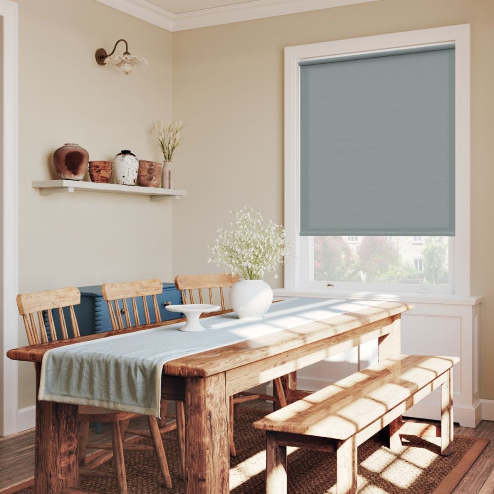 This cool-toned teal dimout roller blind features a subtle woven texture that adds depth and warmth. Gently reducing light while maintaining privacy, it offers a perfect balance of softness and sophistication - ideal for creating a calm, contemporary atmosphere.