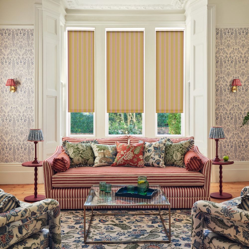 JL x Sanderson Arbre Stripe, Ochre Raspberry Roller Blind
