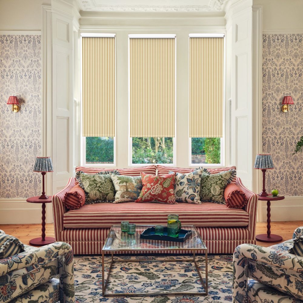 Soft gold tones and vintage vertical stripes give this design a timeless yet contemporary feel, suited to any room needing warmth and sophistication.