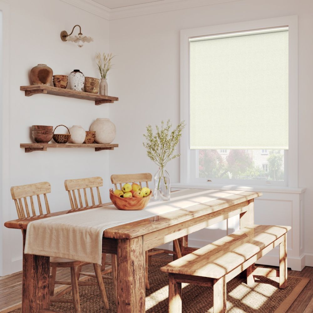 This dimout roller blind in a soft oat-cream hue with warm ivory undertones features a bouclé-like textured fabric. It gently softens daylight while maintaining privacy, adding tactile warmth and refined calm to contemporary living spaces, kitchens, and home offices.