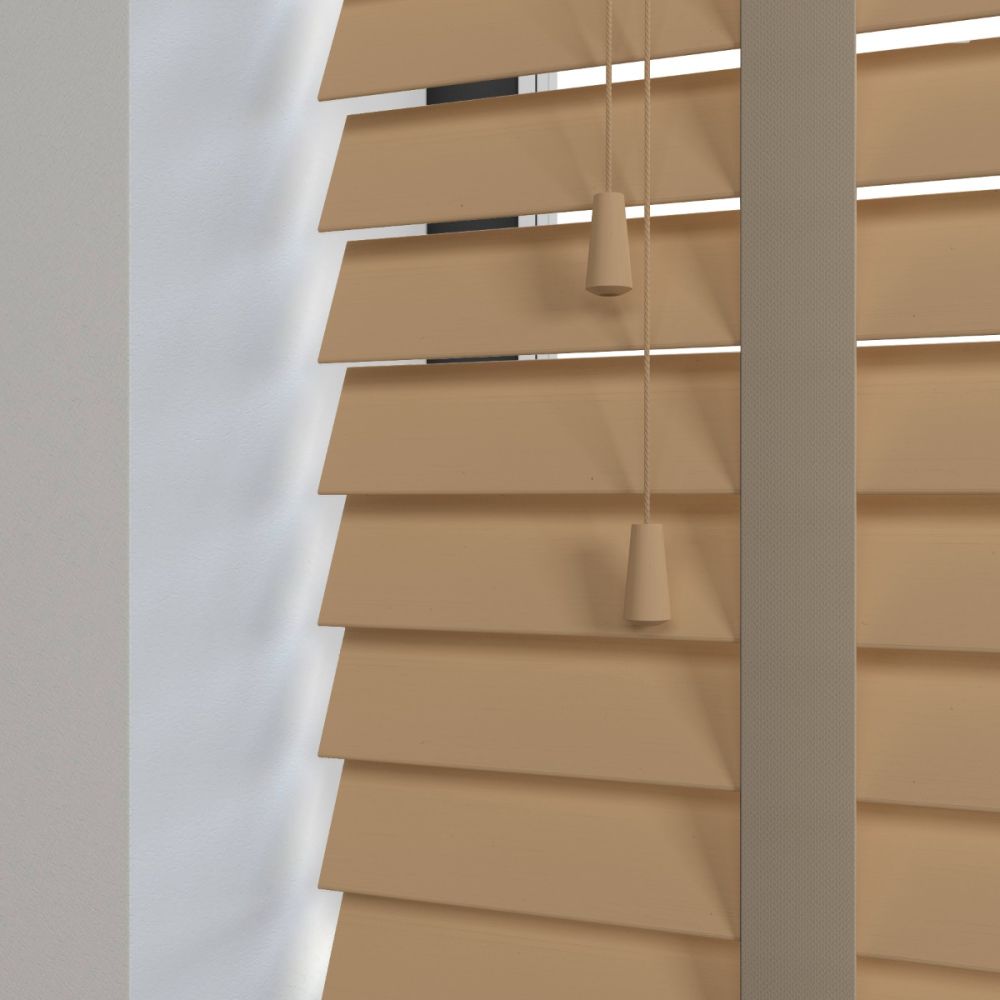 Our wooden and faux wood blinds feature a sturdy, color-coded headrail matching the color of your slats. For blinds with 50mm slats, the headrail dimensions are 42mm in height and 59mm in depth.