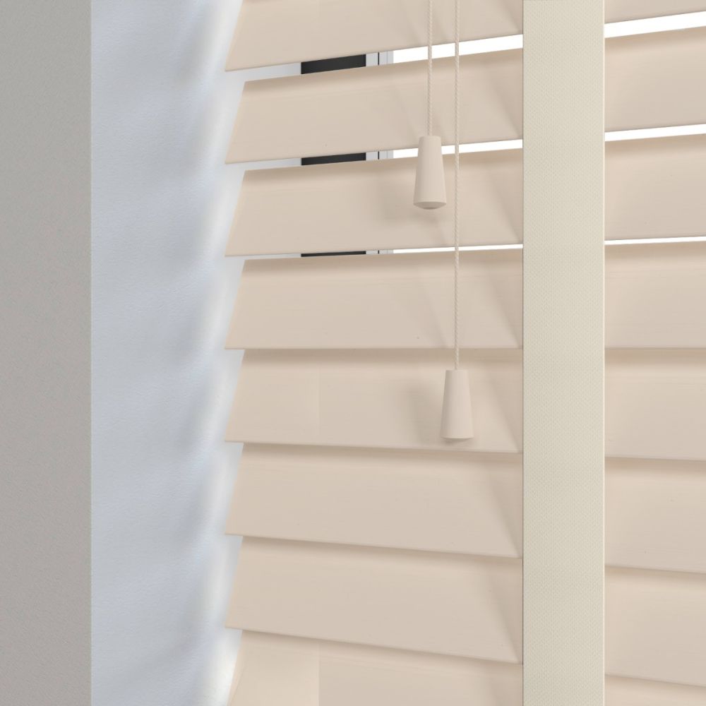 Our wooden and faux wood blinds feature a sturdy, color-coded headrail matching the color of your slats. For blinds with 50mm slats, the headrail dimensions are 42mm in height and 59mm in depth.