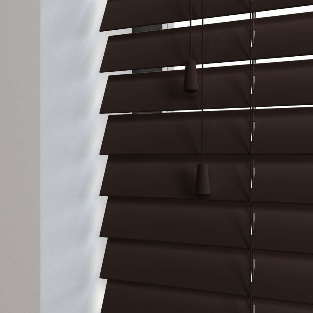 Our wooden and faux wood blinds feature a sturdy, color-coded headrail matching the color of your slats. For blinds with 50mm slats, the headrail dimensions are 42mm in height and 59mm in depth.
